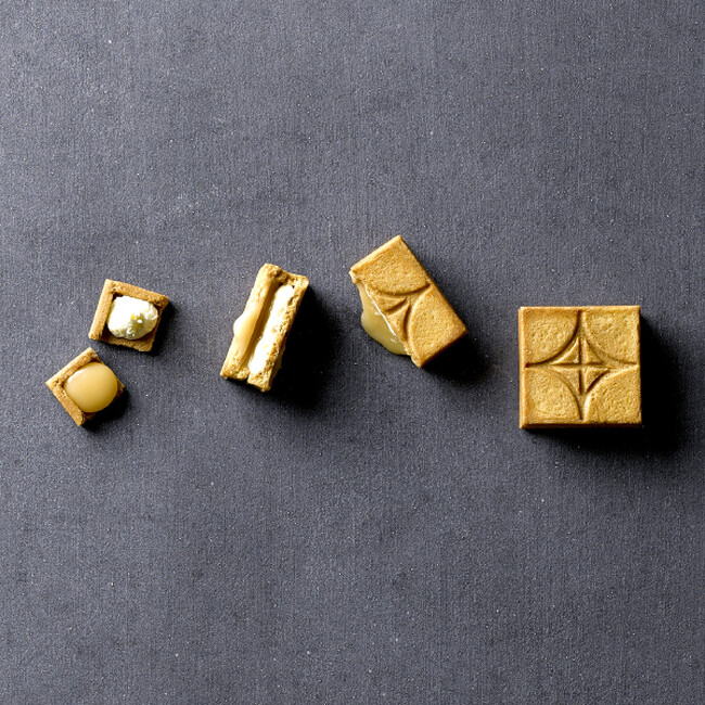 北海道産のバターを使ったサクサク食感のクッキー生地に、アーモンドを混ぜ込んだキャラメルを重ねています。キャラメルには柑橘をアクセントに効かせ、アーモンドとキャラメルの芳醇な香りとコクを引き立てます。