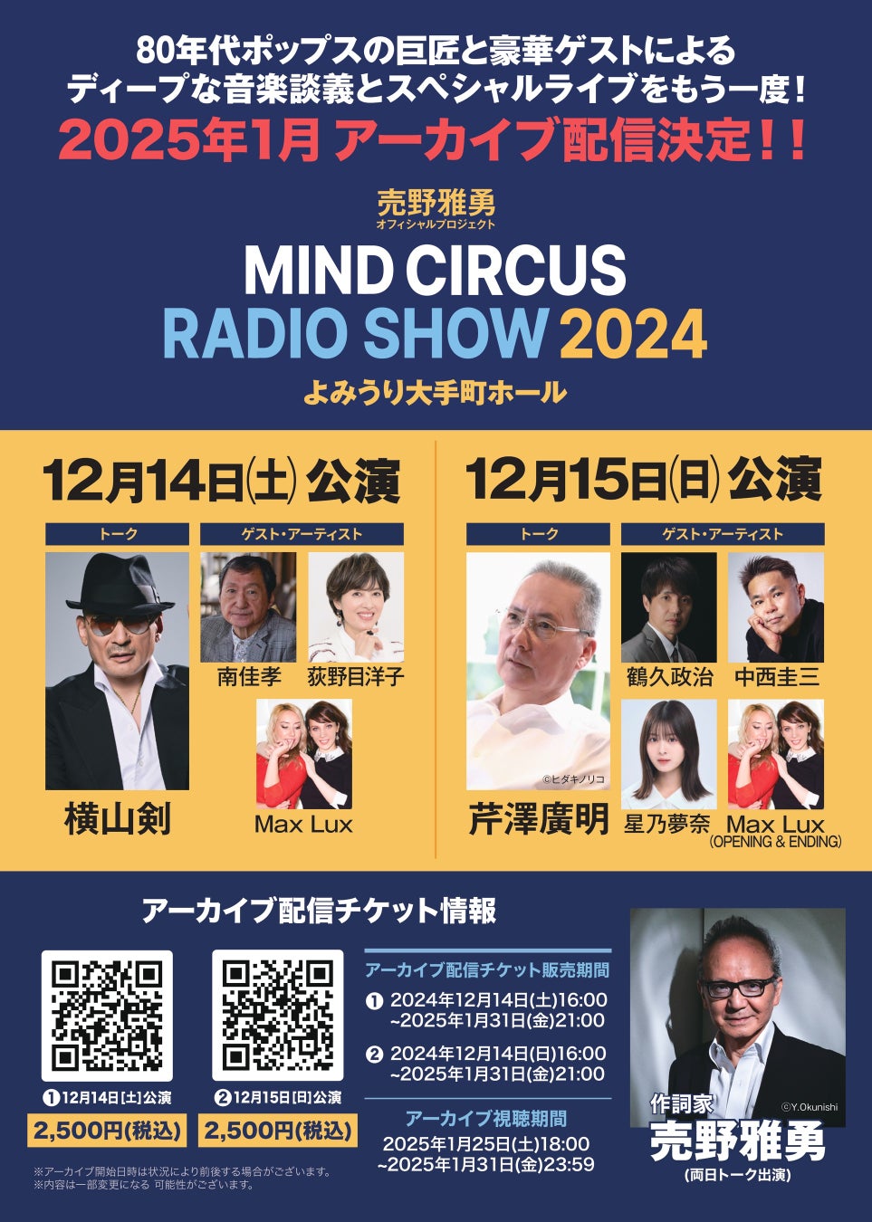 12月13日(金)~15日(日)、東京・よみうり大手町ホールにて、「売野雅勇 MIND CIRCUS RADIO SHOW 2024」を全3公演開催。このうち、12月14日(土)と15日(日)のアーカイブ配信が2025年1月25日(土)18時にスタートします。
