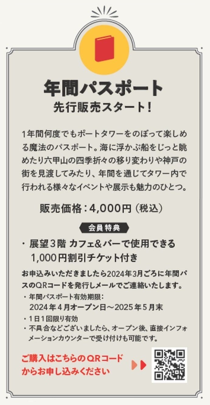 1年間何度でもポートタワーの展望フロアへ登って楽しめるパスポートです。販売価格は4000円(税込み)展望3階「カフェ&バー」で使える1000円割引チケット付きです。