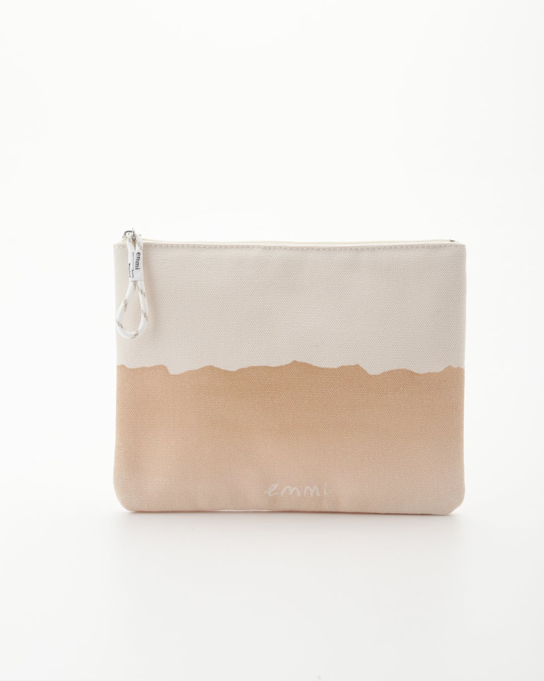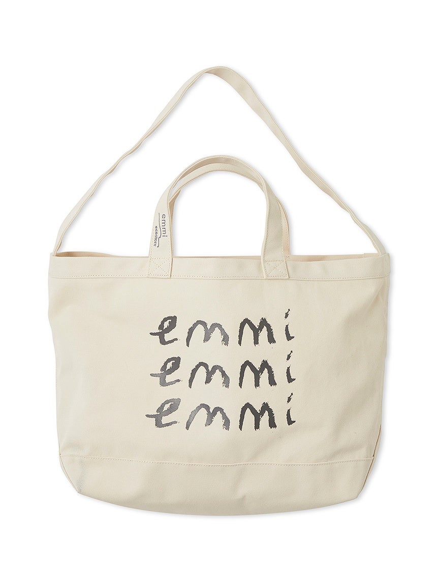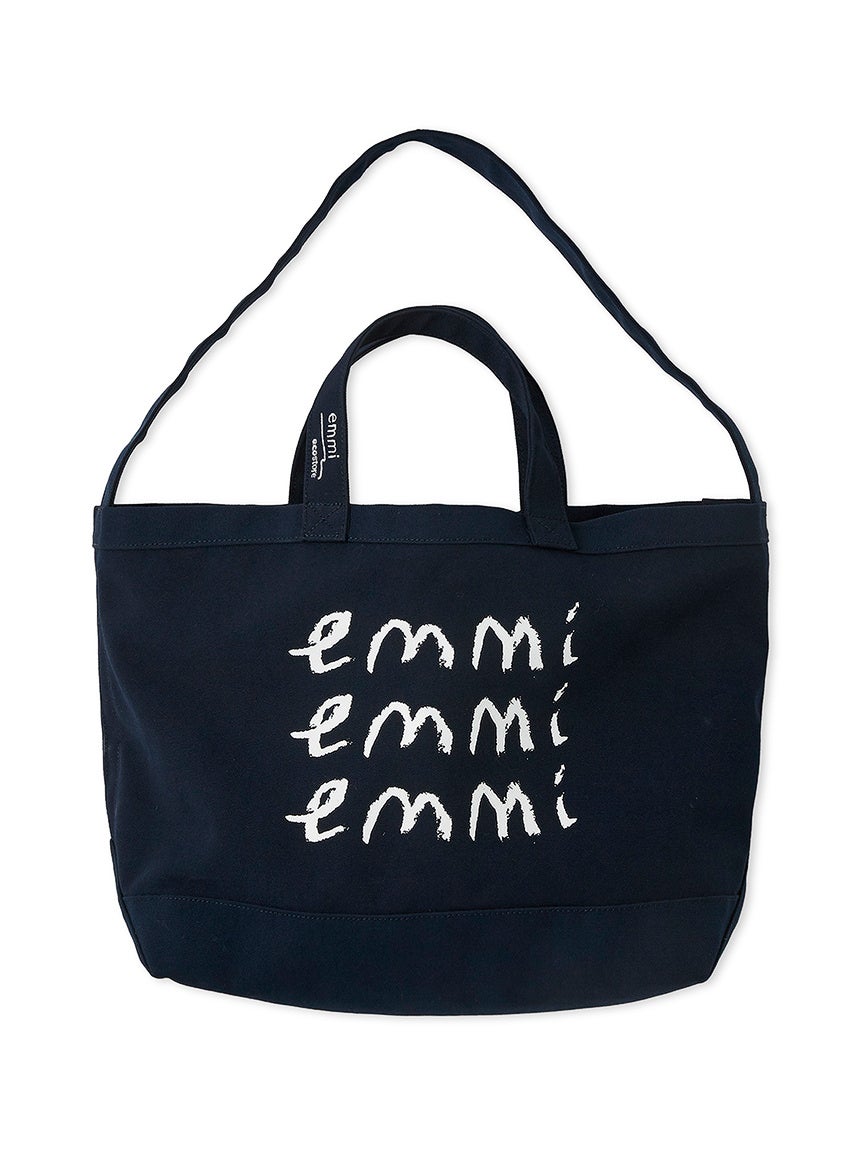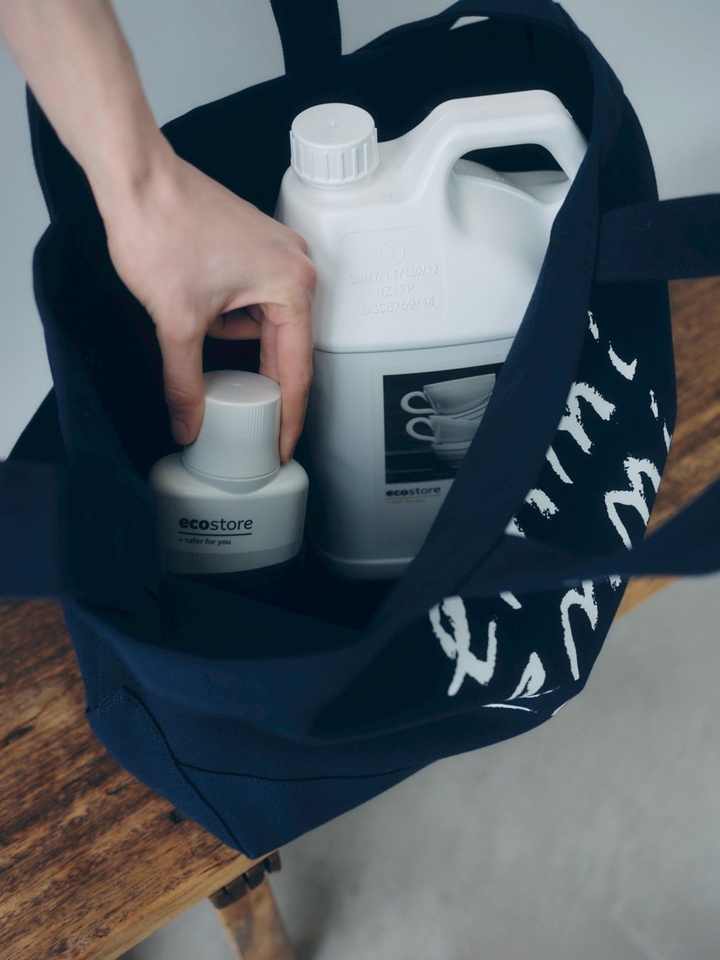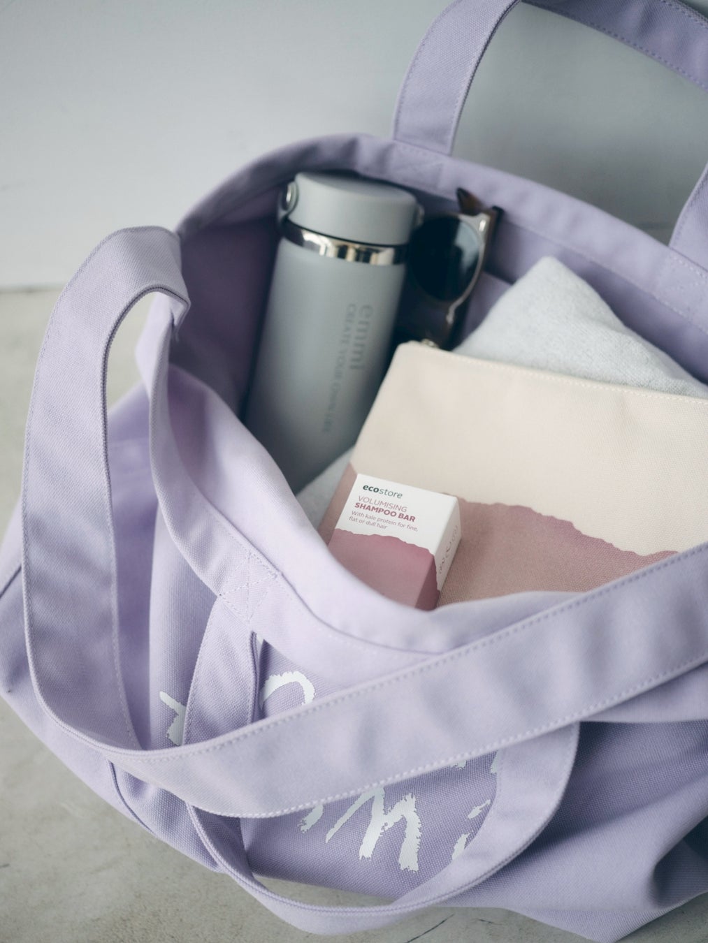 厚く耐久性のあるキャンバス生地を使用し、海へのレジャーなどemmiでも大切にしているアウトドアシーンやランドリーバッグなど、ライフスタイルの幅広いシーンでお使いいただける大容量のバッグ。有機的なグラフィックロゴプリントがアクセントになっており、内側にecostoreランドリーボトル500mlやタンブラーも収納できるホルダー付きの仕様。素材にはペットボトルなどを再生したリサイクルポリエステルを使用しています。