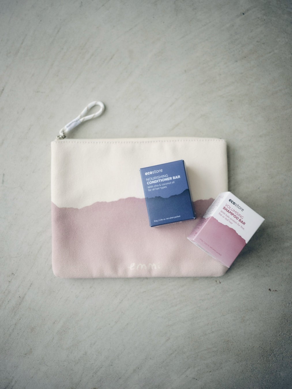 今回のemmi×ecostoreコラボレーションコレクションのデザインのインスピレーションの元となったのは、ecostoreの「シャンプーバー&コンディショナーバー」の商品パッケージやカラーリングです。