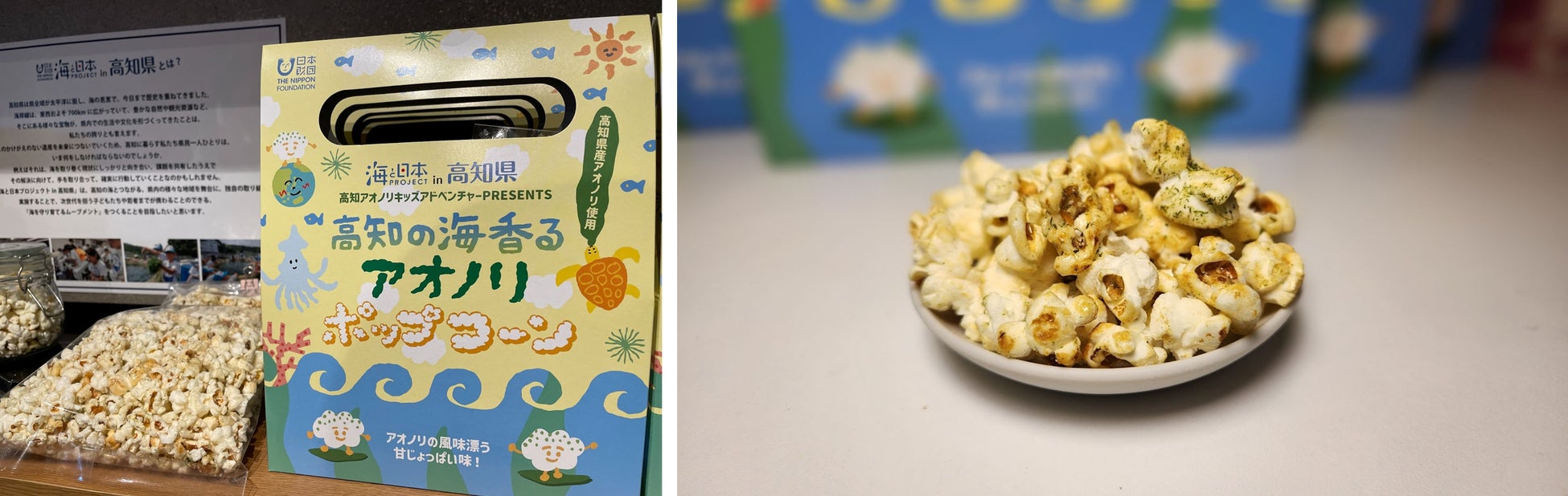 しかし、近年の海の温暖化などにより高知県にも悪い影響が見え始めています。高知大学での研究や生き物観察などさまざまな体験を通して、子どもたちは「今、高知の海で起きている変化」を実感しました。「美しい海を未来に繋ぐために自分たちにできること」その一つが、高知大学発のベンチャー企業「海の研究舎」で陸上栽培された「スジアオノリ」の風味豊かなポップコーンです。「アオノリを守りたい」という思いを込め、子どもたちのイラストが描かれたパッケージになっています。