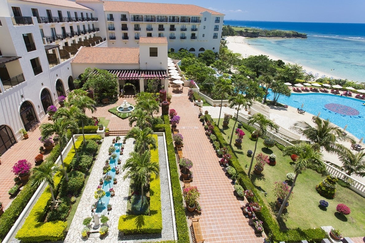 ホテル日航アリビラは、異国情緒漂うスパニッシュコロニアル調の建物が特徴的なオンザビーチのリゾートホテルです。ホテルの目の前は「アリビラブルー」と称される沖縄本島屈指の透明度を誇る海が広がります。