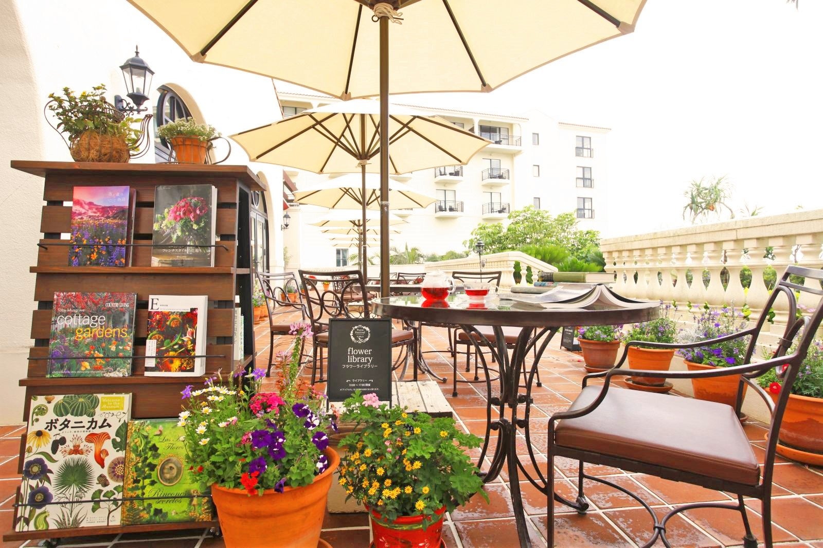 花や植物にまつわる書籍が並ぶ「フラワーライブラリー」がラウンジテラスにオープン。お気に入りの本とともにゆったりとしたティータイムをお過ごしください。