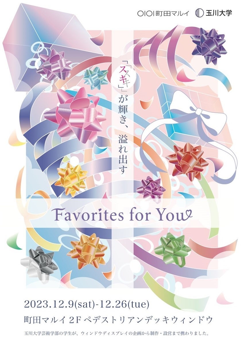 テーマ理解を深める中で学生⼀⼈ひとりが⾃分の興味を追求し、「スキ」を楽しむことが個々の「ウェルビーイング」(=心身の幸せや健康)を向上させることにつながるという考えにいたり、タイトルは、『Favorites for You 〜「スキ」が輝き、溢れ出す〜』となりました。ディスプレイをご覧いただく⽅々に「⼼⾝の幸せ」を感じていただけるディスプレイデザインをめざしています。ぜひお楽しみください。