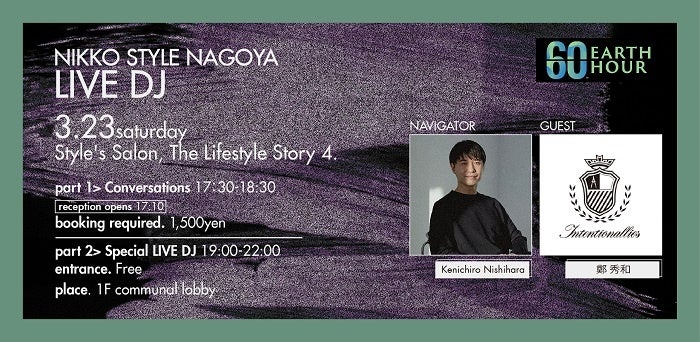 LIVE DJ by Kenichiro Nishihara & 鄭秀和 開催中の会場内減灯(1F コミューナルロビー) *当日開催する『Style’s Salon, The Lifestyle Story 4.』の中で、 LIVE DJの前に行う特別トークセッション(17:30~18:30)では 環境・SDGsに関する話題にも触れる予定をしております。 続くLIVE DJではEARTH HOURをイメージした選曲(一部)をする予定です。 |
