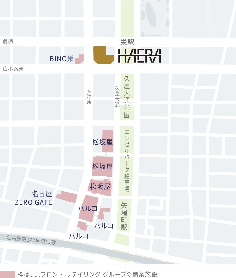 特に名古屋 栄は重要エリアと位置づけています。HAERAの開業を起点に、松坂屋名古屋店、名古屋PARCO、BINO栄、名古屋ZERO GATE、JFRカード等をはじめ、グループ外の地域の施設・サービスとも連携し、街の賑いを創出、名古屋栄エリアのさらなる魅力向上や活性化に貢献します。