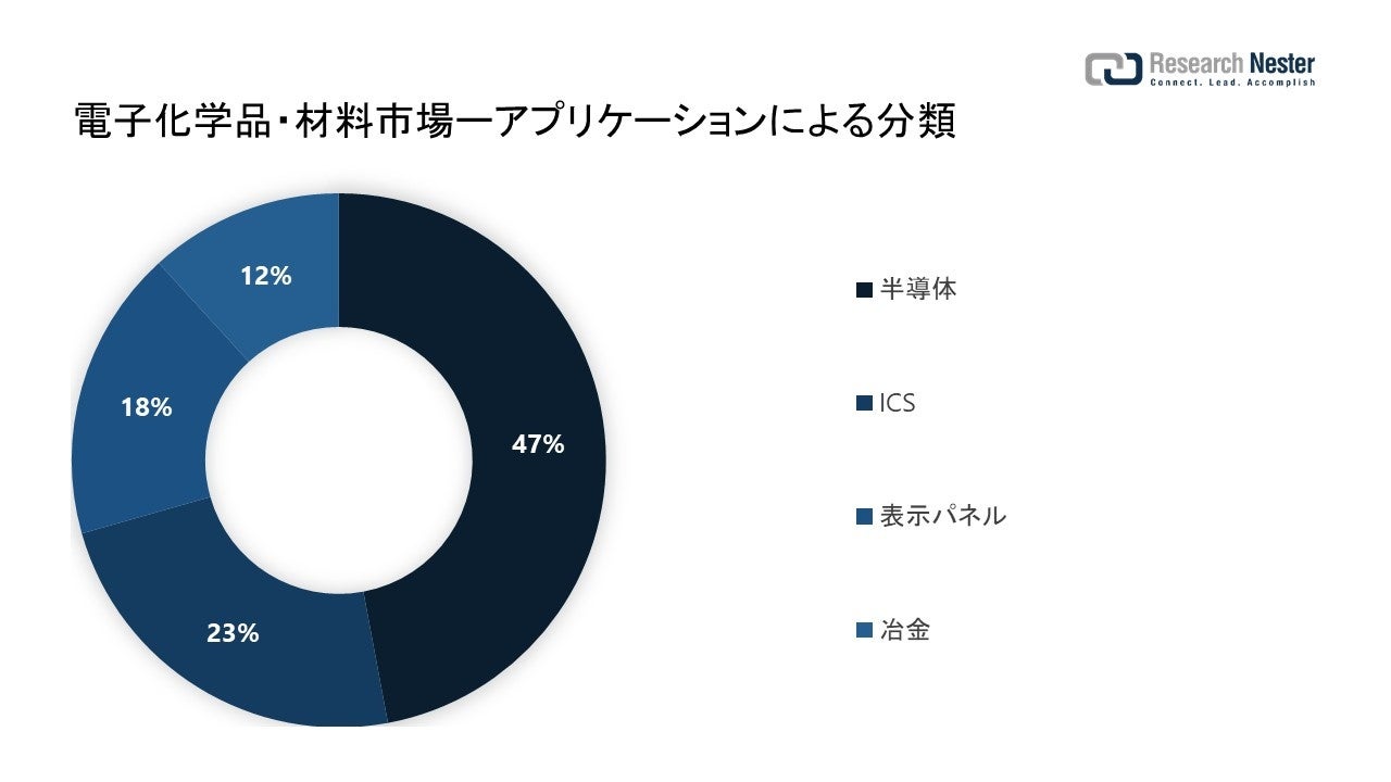 アプリケーションに基づいて、世界の電子化学・材料市場は、半導体、ICs、表示 パネル、および冶金への需要と供給について分割および分析されます。これらのセグメントのうち、半導体セグメントは 2033 年まで最大の市場シェアを保持し続けると予想されます。これは、エッチング、洗浄、およびメンテナンスによって半導体の性能を向上させるために、電子化学物質および材料が最も広く使用されているという事実に基づいています。 2023 年までに世界中で約 7 兆米ドルがデジタル トランスフォーメーションに投資されると予測されているため、半導体は今後最も需要の高い製品の 1 つになると予測されています。