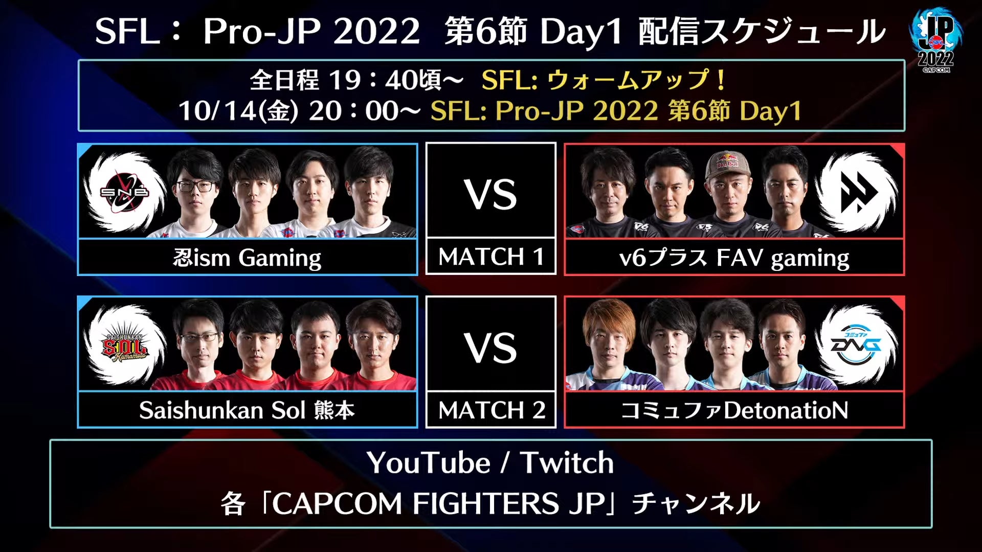 「ストリートファイターリーグ: Pro-JP 2022」第6節Day1は、10月14日(金)20時から「CAPCOM Fighters JP」の公式YouTube、Twitchチャンネルにて配信します。