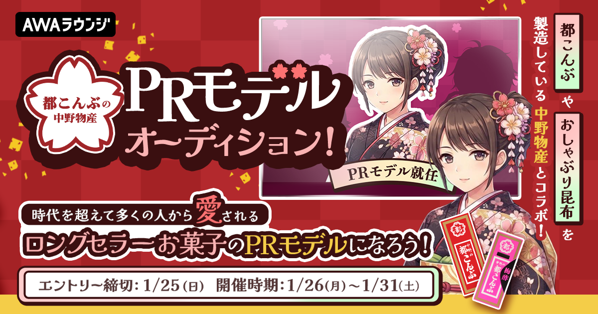 AWA株式会社(本社:東京都港区、代表取締役CEO:冨樫晃己)が運営する、サブスクリプション型(定額制)音楽ストリーミングサービス「AWA(アワ)」は、時代を超えて多くの人から愛されるロングセラーお菓子のPRモデルになれる、『都こんぶ』の中野物産🌸PRモデルオーディションを開催いたします。