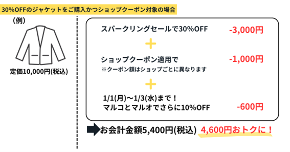 さらに『お正月 マルコとマルオの3日間』の期間中は、半期に1度の『スパークリングセール』が同時開催中!そのため、セール対象アイテムが、さらに10%OFFでお買い物いただけますので、大変おトクな期間です。『お正月 マルコとマルオの3日間』と『スパークリングセール』が同時開催中の貴重なこの機会をお見逃しなく!