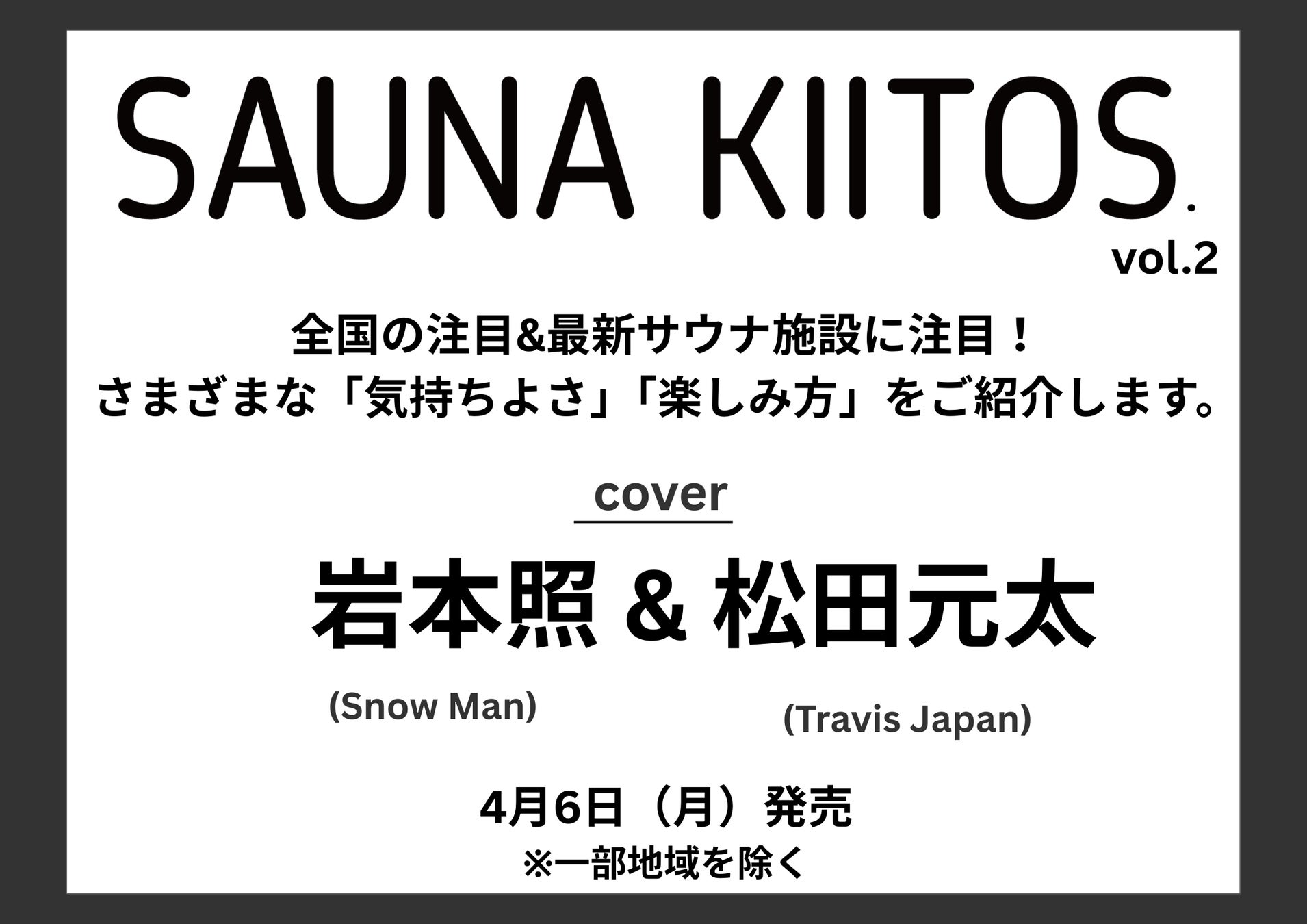 今すぐサウナに行きたくなる!! サウナライフマガジン「SAUNA KIITOS.vol.2」が4月6日(月)に発売! 表紙は岩本照&松田元太!!