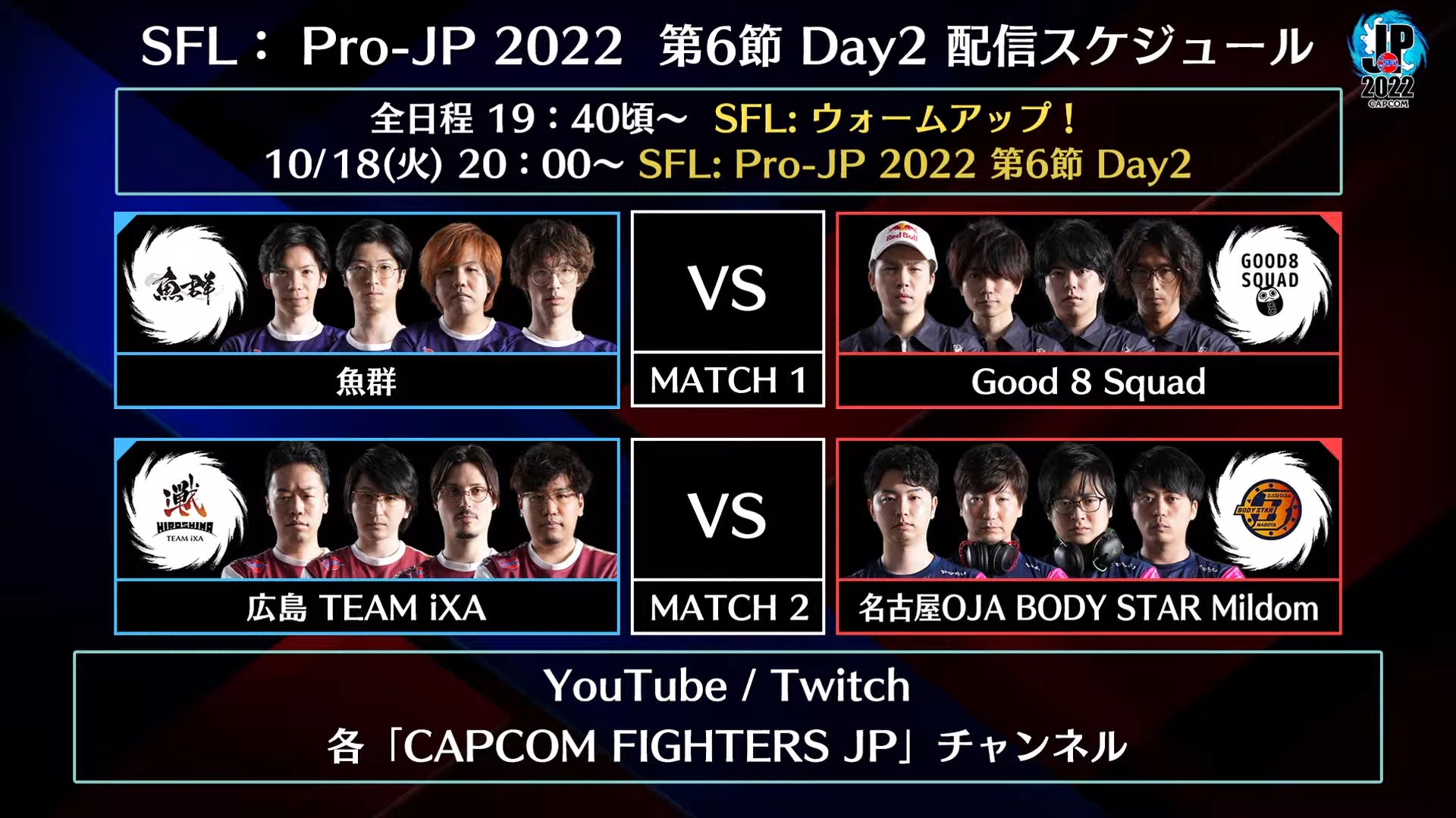 「ストリートファイターリーグ: Pro-JP 2022」第6節Day2は、10月18日(火)20時から「CAPCOM Fighters JP」の公式YouTube、Twitchチャンネルにて配信します。