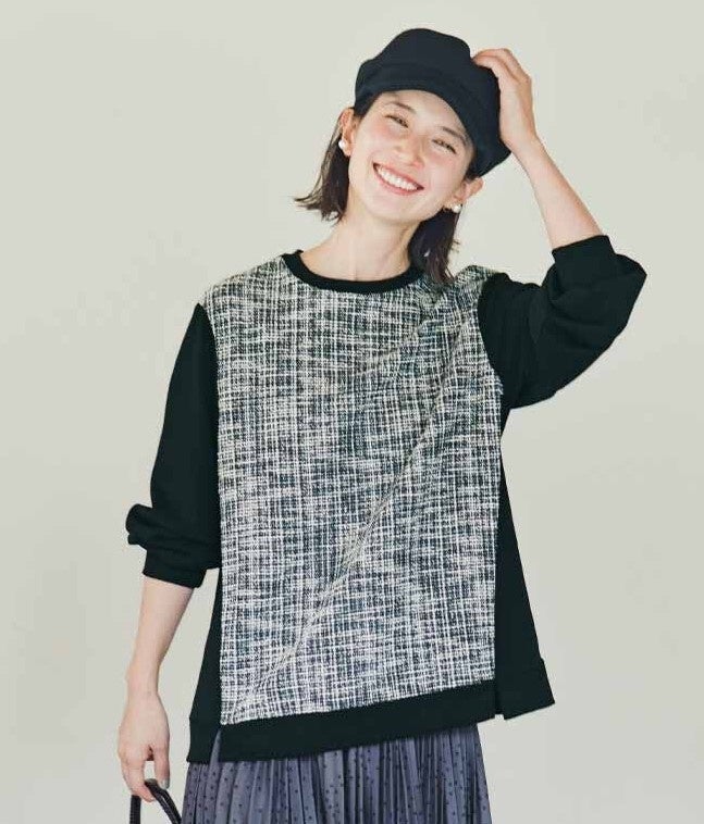 ジョーゼットとツイードのコンビが素敵なトップスは、どちらもカットソーなので伸びよく快適です。華やいだ印象で、リラックスした着心地をかなえます。からだのラインをひろいにくいシルエットやふんわり袖など、大人にうれしい美設計がこだわりです。