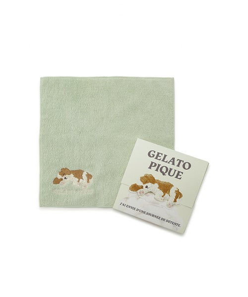 幸せそうな寝顔の子犬の刺繍が、そっと癒しを添えるデザインです。