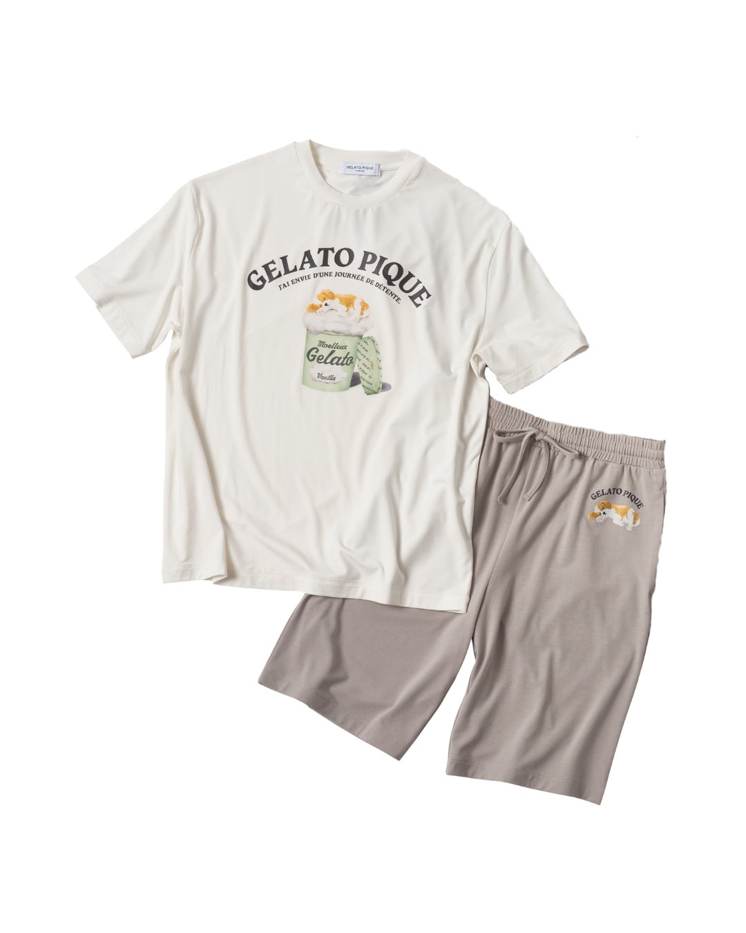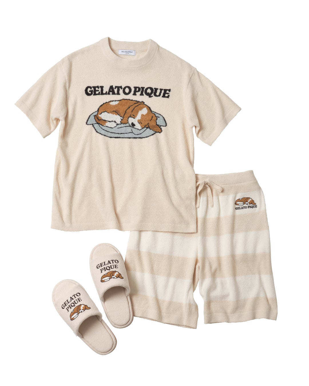 肌に触れるとひんやり気持ちいい、なめらかな接触冷感レーヨン素材を使用したTシャツは、胸元に控えめなワンポイント刺繍をあしらったシンプルなデザイン。セットのハーフパンツには、腰元にちょこんと眠る子犬のプリントを添え、ゆったりとしたシルエットでリラックス感たっぷりに仕上げました。