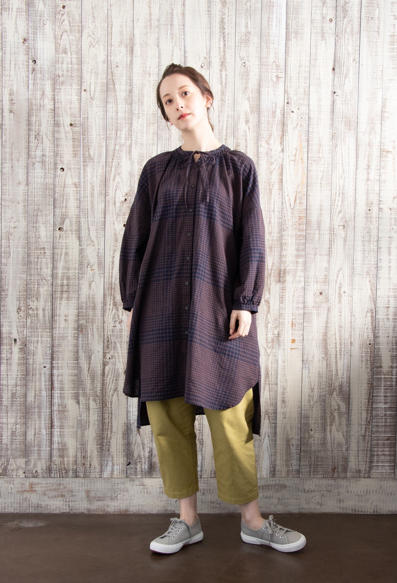 首元のシャーリングとリボンがポイントの前開きチュニックです。前後の丈差がトレンドのポイントです。チェック柄、無地を展開しコーディネートの幅を広げます。麻のシャリ感とカポックの軽さでナチュラルな雰囲気を醸し出します。