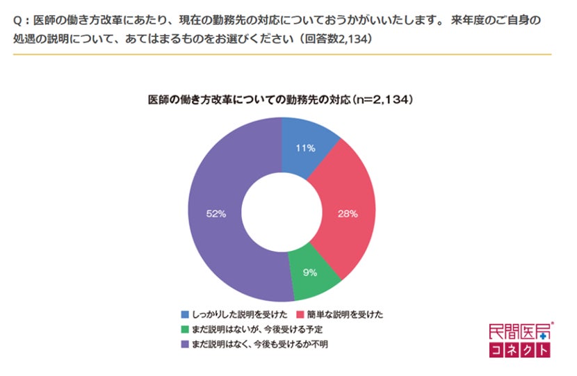 「まだ説明はなく、今後も受けるか不明」が最も多く、50%を超えていました。「しっかりした説明を受けた」は11%、「簡単な説明を受けた」は28%という結果になりました。アンケート実施時点(2023年11月時点)では、多くの医師が説明を受けていないか、受けていたとしても簡単な説明にとどまっていることがわかりました。