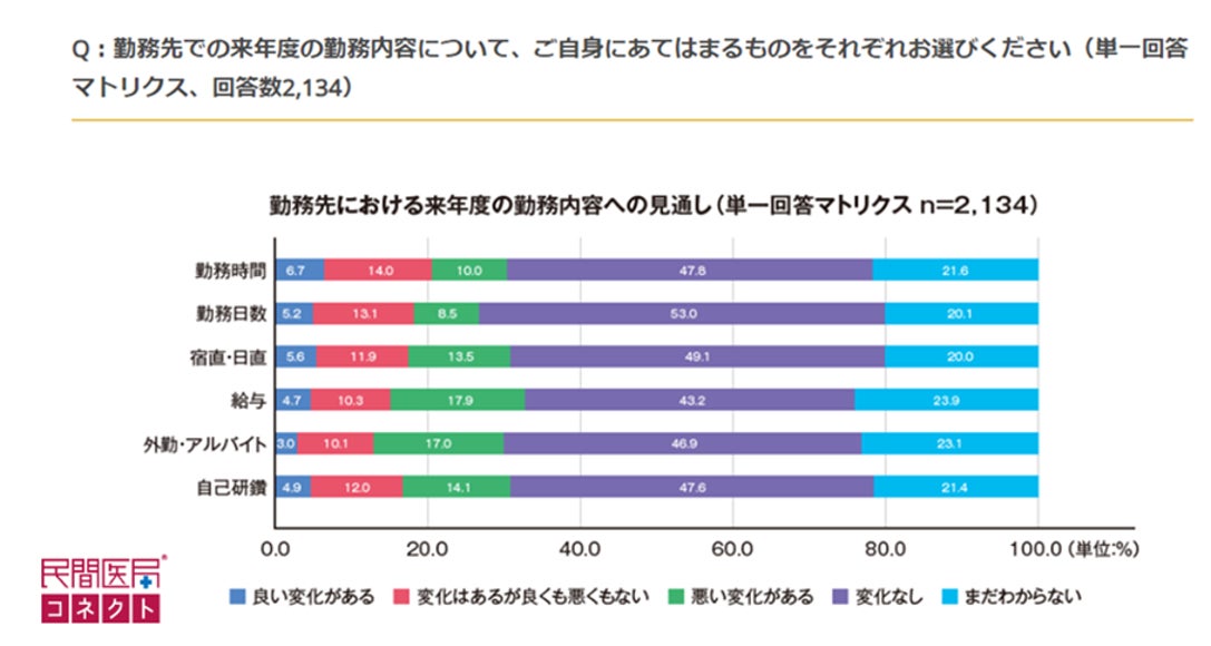 一方で、「悪い変化がある」の回答率が最も高い項目は「給与」の17.9%でした。「外勤・アルバイト」の17.0%、「自己研鑽」の14.1%が続きます。収入に対して、悪い変化が起こると考えていることが読み取れます。