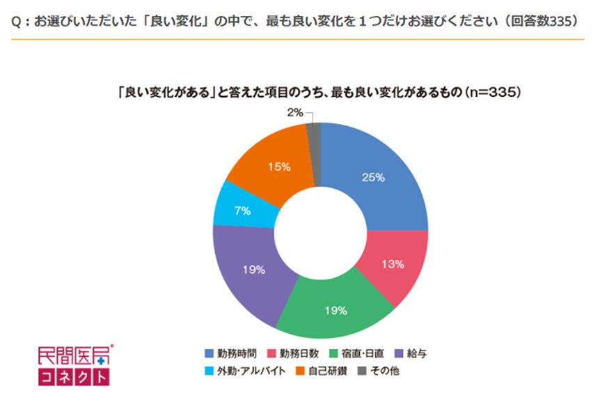 「良い変化がある」と答えた医師は、どの項目で最も良い変化があると感じているのかについて質問しました。最も良い変化があるのは「勤務時間」がトップで、4人に1人が回答しました。次いで「給与」、「宿直・日直」の順となりました。