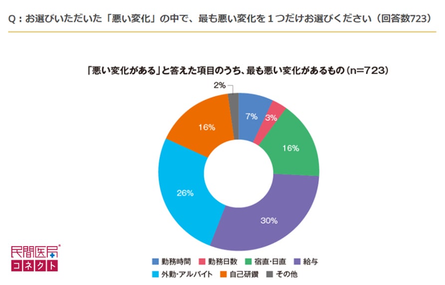 「悪い変化がある」と答えた医師は、どの項目で最も悪い変化があると感じているのかについて質問しました。最も悪い変化があるのは「給与」がトップで、30%の医師が回答しました。 続いて「外勤・アルバイト」が26%、「宿直・日直」と「自己研鑽」が共に16%となりました。