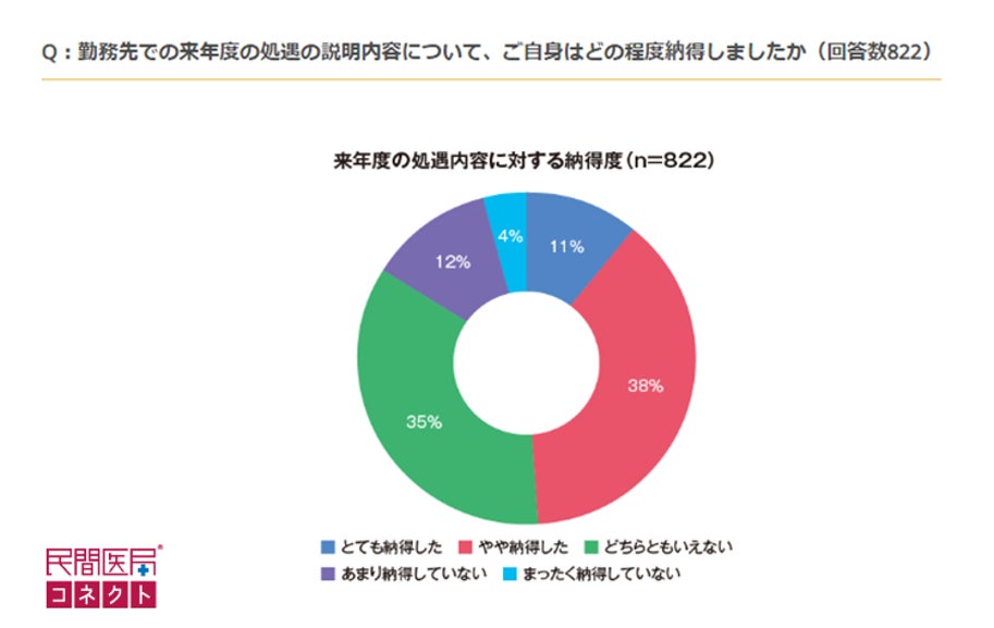 説明を受けた医師に処遇への説明内容にどの程度納得できたのかについて聞いたところ、「とても納得した」11%、「やや納得した」38%と、説明を受けた医師のうちおよそ50%が納得していると回答しました。一方で「どちらともいえない」と答えた医師が35%、「あまり納得していない」は12%、「まったく納得していない」と回答した医師も4%いました。