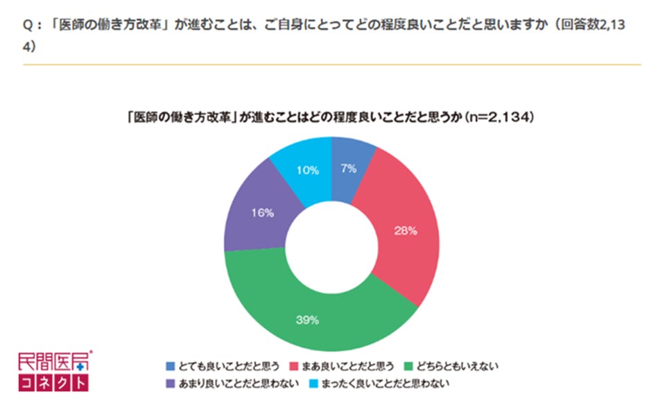 今回のアンケートでは、医師たちは、2024年4月から始まる医師の働き方改革により起こる(または起き始めている)変化を、すでに具体的に感じたり、考えていたりすることがわかりました。調査結果では、「良い変化」よりも「悪い変化」を見通している医師が多い傾向となりましたが、その一方で働き方改革全体については「どちらともいえない」「良いこと」「良いことだと思わない」の順に意見が分かれました。