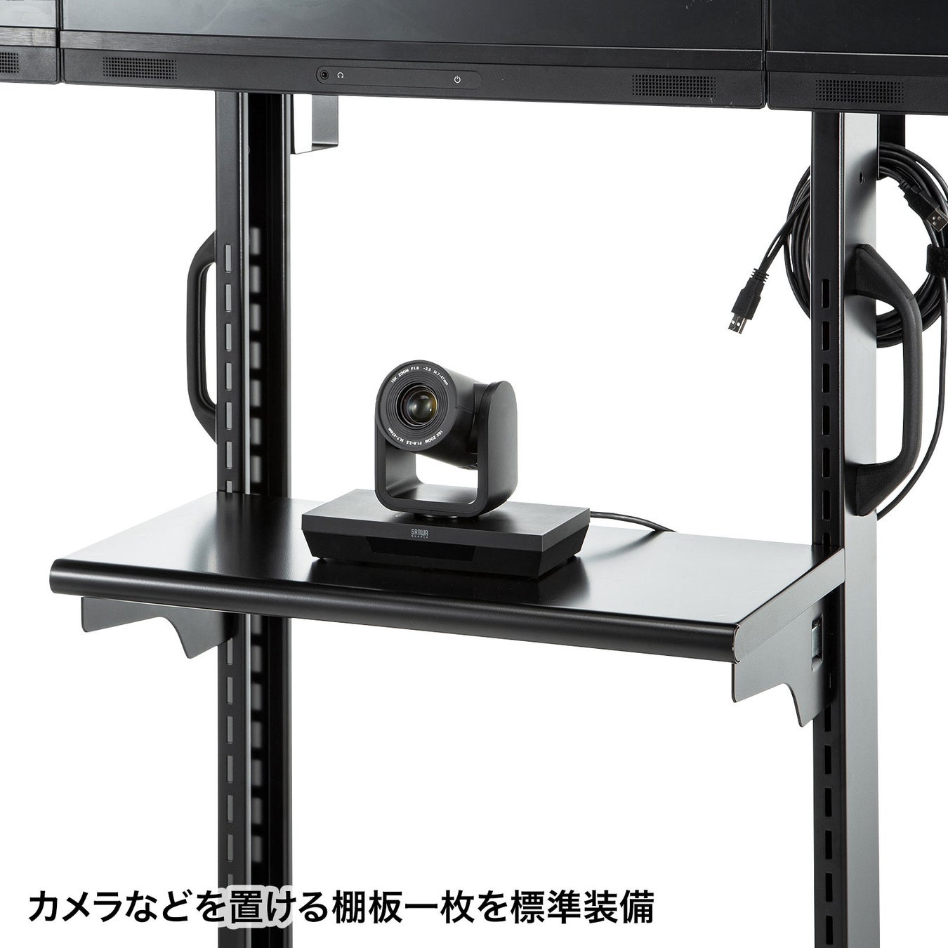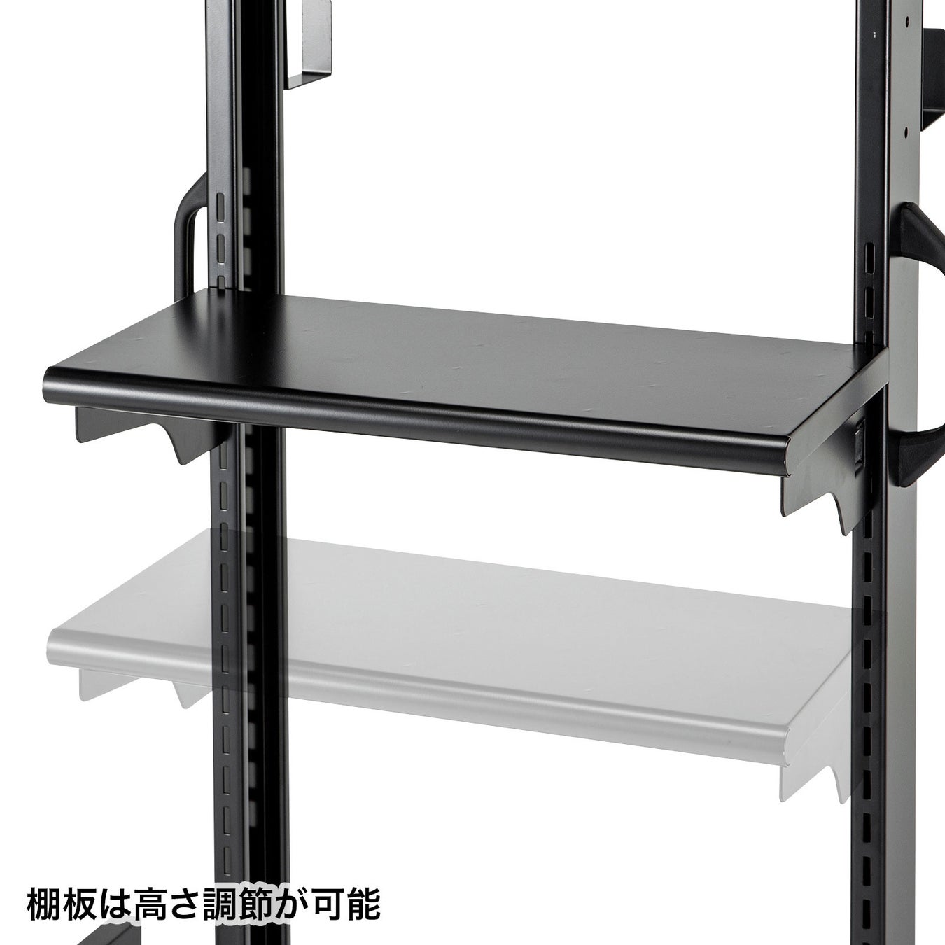 棚板一枚を標準装備しており、機器やスピーカー、WEBカメラなどを設置できます。高さ調節が可能で、前方・後方どちらにも設定できます。