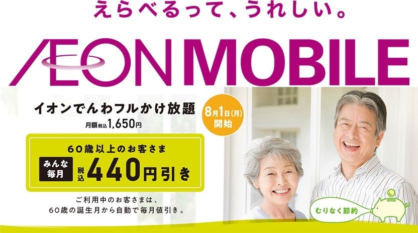 イオンリテールが提供するMVNOサービス「イオンモバイル」は、8月1日(月)より、60歳以上の契約者につきましては、「イオンでんわ フルかけ放題」の月額利用料金から税込440円値引きし、実質税込1,210円で利用できます。