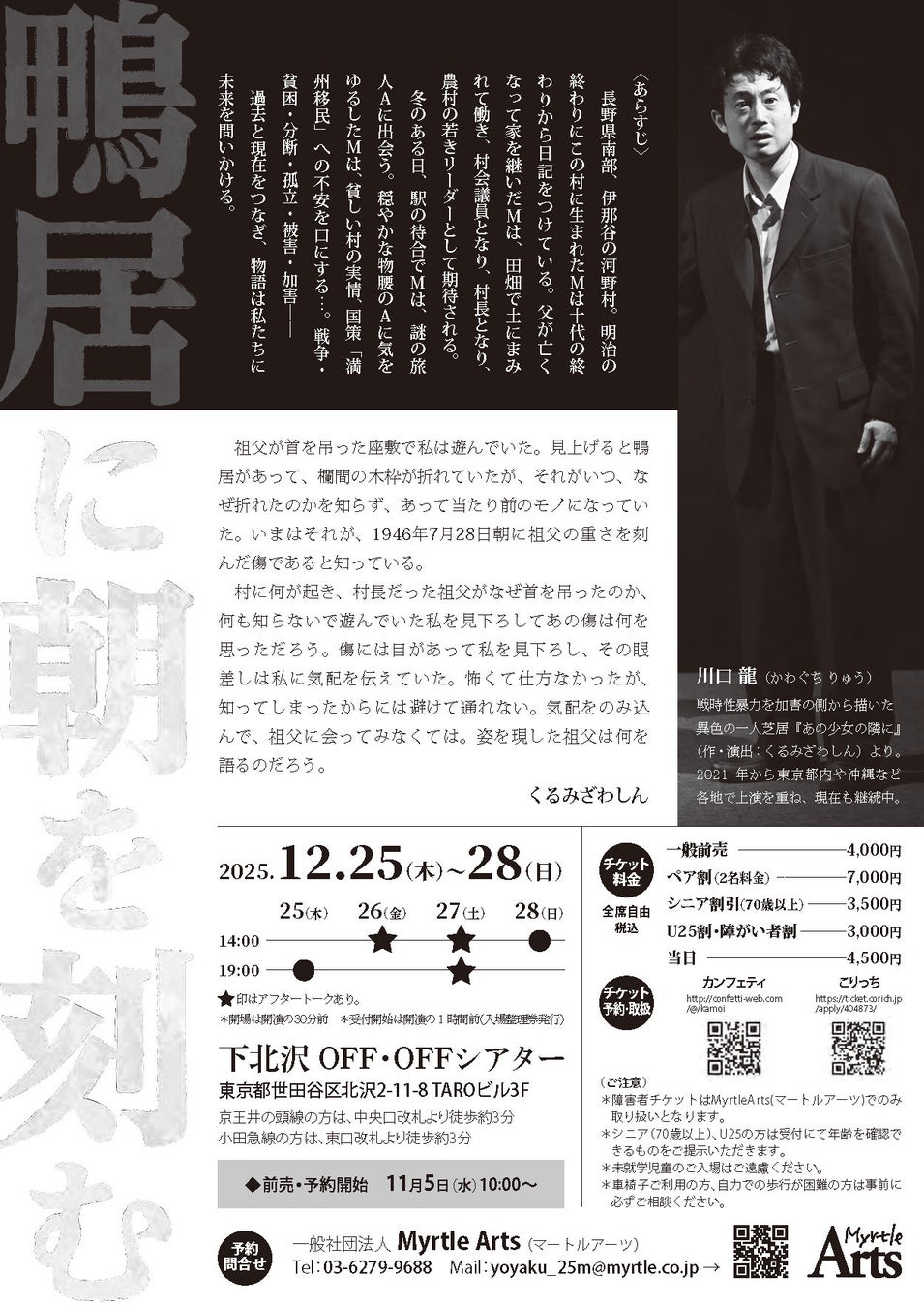 『鴨居に朝を刻む』が2025年12月25日 (木) 〜 2025年12月28日 (日)に下北沢 OFF・OFFシアター(東京都 世田谷区 北沢 2-11-8 TAROビル3F)にて上演されます。