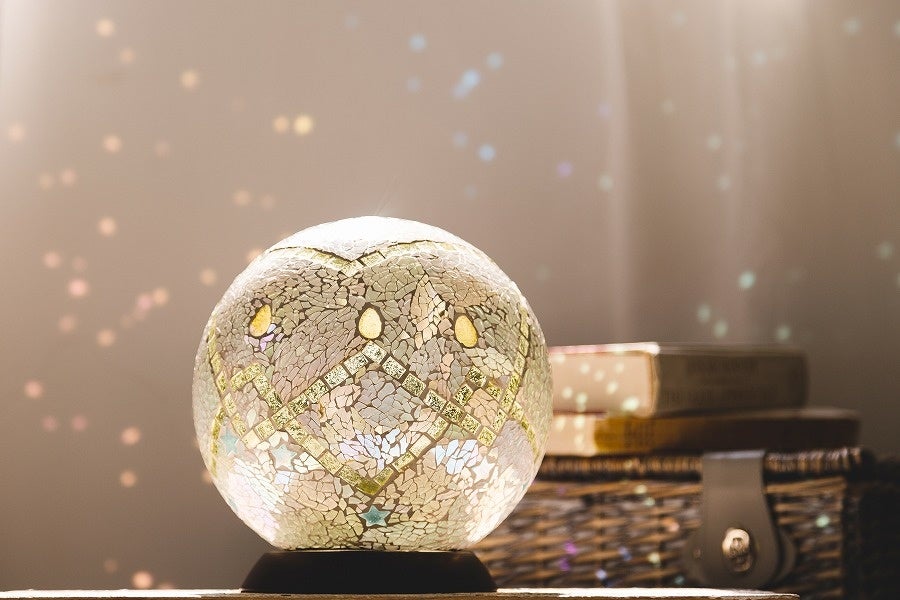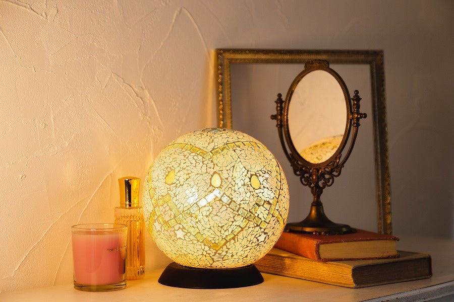 日当たりの良い壁際に置いておくと、消灯時でも陽の光を受けて壁にキラキラと美しい光の模様が浮かび上がります。存在感がありつつも、全体に落ち着いた色合いで派手すぎず、普段づかいのインテリアにぴったりなランプです。