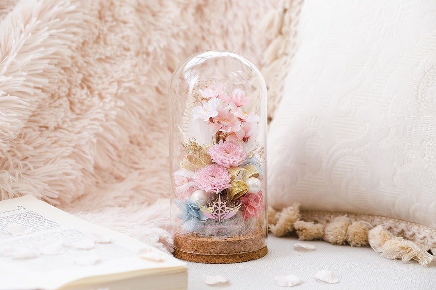 さくらちゃんをイメージしたピンク色の花を中心に、作品の「ふわふわキラキラ感」を表した空色とゴールドを差し色として加えたフラワードーム。