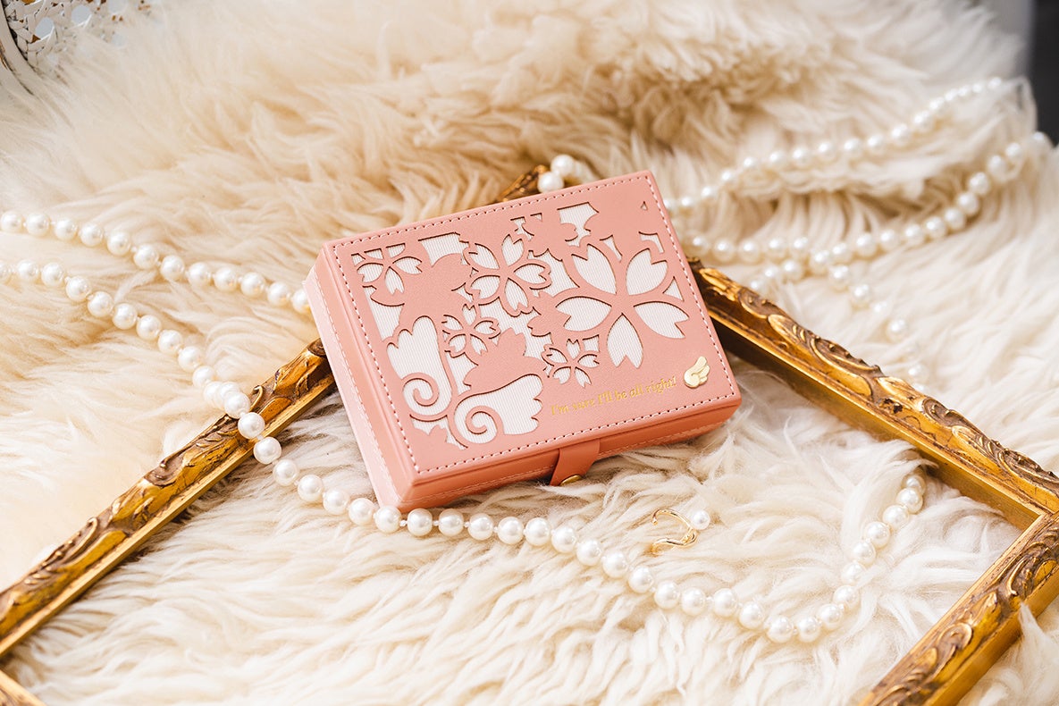 天面には、さり気なく桜と羽根の柄の透かしを入れ、シンプルながら、フェミニンなデザインとなっています。