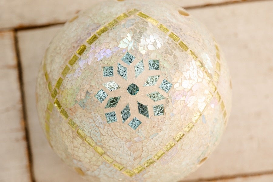 モザイクガラスは電気をつけているときはもちろん、消灯時にも美しく、また、点灯しているときと消灯しているときの雰囲気が違うのも魅力的です。