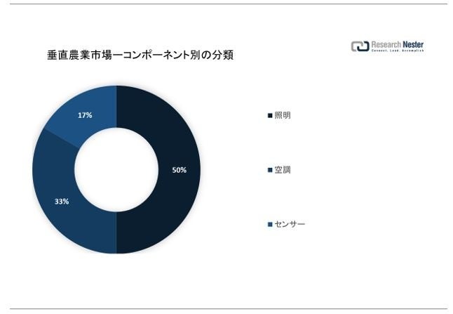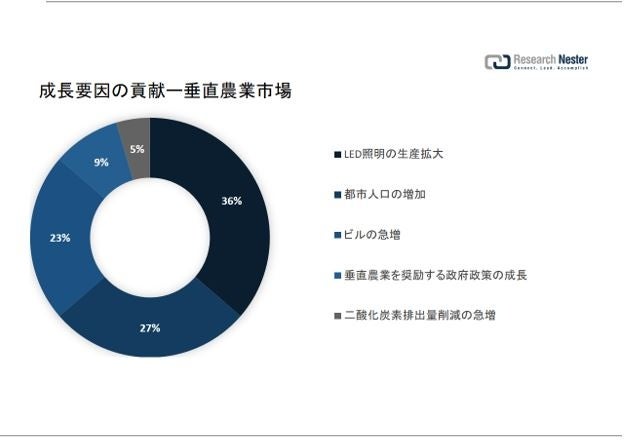 LED照明の生産拡大ー2012-2019 年の間に、LED セクターの普及率が高まり、2025 年までに普及率がほぼ 75% に達すると予想されています。したがって、LED 照明の採用が進むにつれて、LED 照明の生産量は増加すると推定されます。さらに、生産量の増加に伴い、垂直農業での LED 照明の使用も増加しています。LED は、優れたエネルギー効率により、最高の強度で非常に長期間に光を提供することができます。代替の照明オプションと比較すると、これらの効率的な照明ソリューションは、ほぼ 6 年間使用できます。熱出力が低く、作物が垂直に積み上げられた狭い場所に収まる能力があるため、LED は垂直農業に最適です。