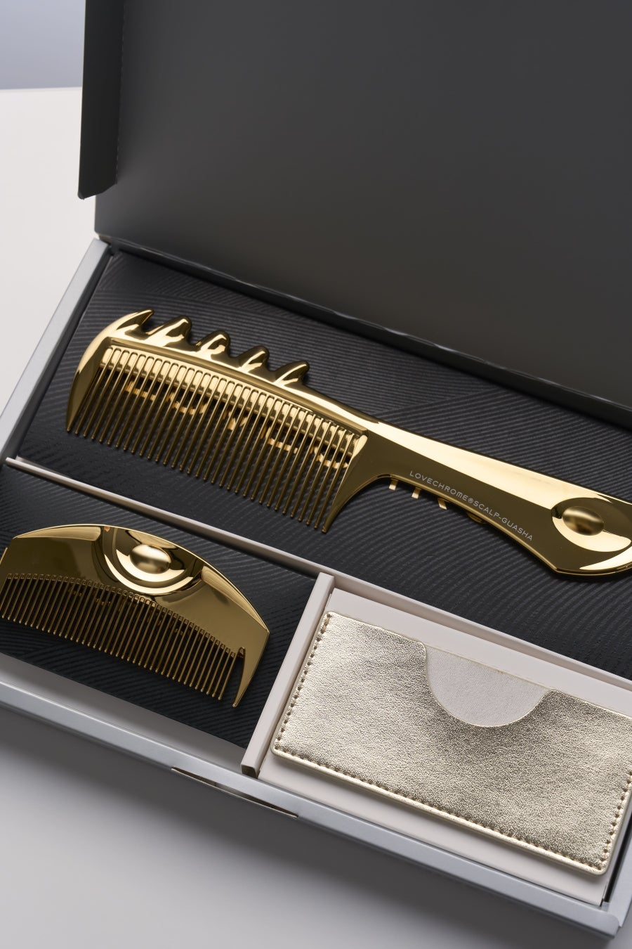 純金使用の、やわらかく、しなやかに髪をいたわる、ラブクロム上級シリーズK24GPゴールドのツキとスカルプカッサの2種類のコーム とケースがセットになった阪急うめだ本店限定のキットを発売いたします。