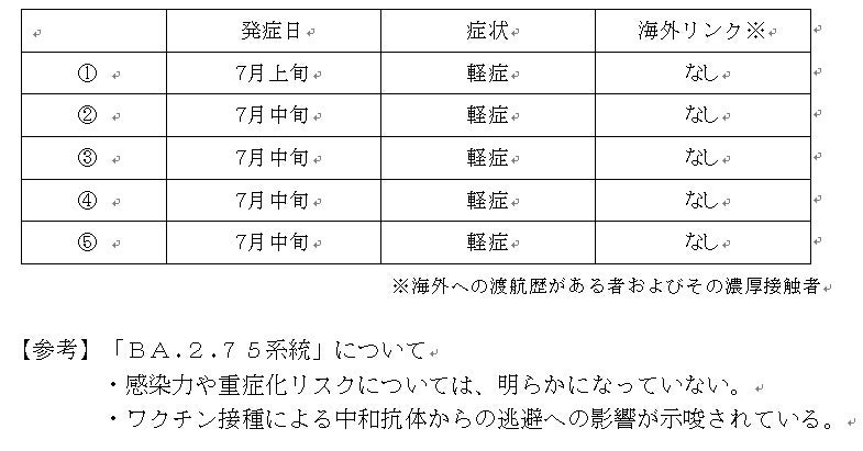 この度、ゲノム解析の結果、新たに、オミクロン株の亜系統である「BA.2.75系統」を5例確認したため、下記のとおり、お知らせいたします。