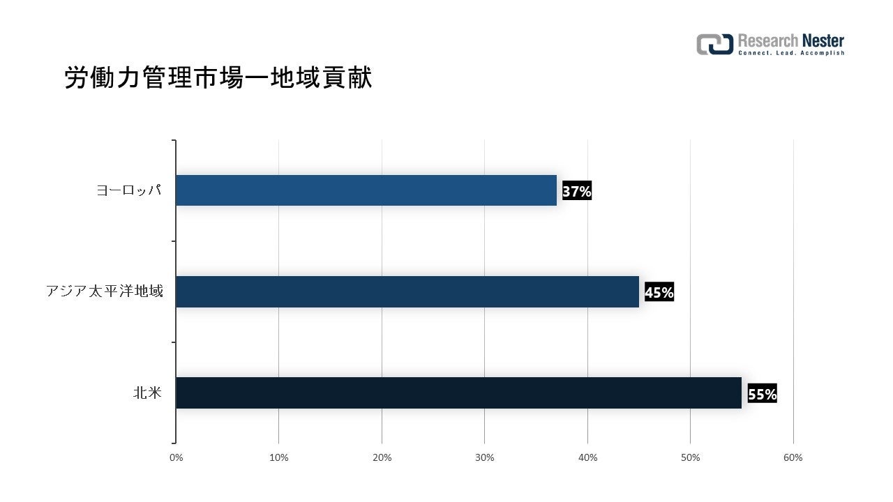アジア太平洋地域の労働力管理市場は 2 番目に大きいと推定されており、2035 年末までに約 27% のシェアを記録しています。市場の成長は、主に企業の生産性向上を目的とした自動化プロジェクトの増加に起因する可能性があります。さらに、「メイク イン インディア」や「デジタル インディア」などの外国投資や政府のイニシアチブの増加が、地域市場の成長をさらに後押ししています。さらに、この地域での新興企業の増加は、革新的な労働力管理ソリューションの開発のためのプラットフォームを提供しています。