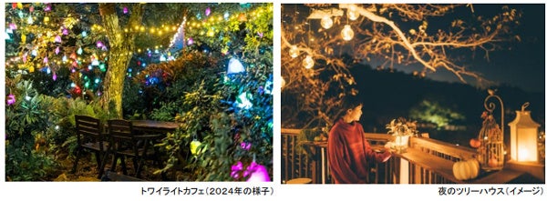 「神戸六甲ミーツ・アート2025 beyond」の夜間限定作品が鑑賞できるほか、ランタン等でライトアップされたガーデン内では、森のCafe(※1)の「トワイライトカフェ」や夜のツリーハウスが楽しめます。10月中旬~11月中旬には、ライトアップした木々の紅葉も見頃となり、幻想的なガーデンを鑑賞できます。