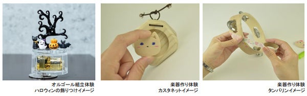 オルゴール職人のサポートのもと、好みの曲、ケース、コースを選んで、自分だけのオルゴール作りが体験できます。ハロウィンにお勧めの飾り付け小物(ハロウィン小物は1点330円~)もご用意しています。