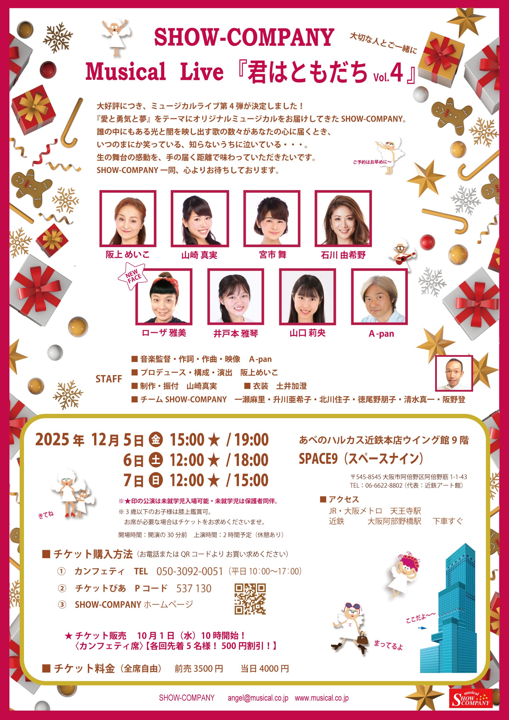 SHOW-COMPANY主催、ミュージカルライブ『君はともだち』が2025年12月5日 (金) 〜 2025年12月7日 (日)にSPACE9(大阪市阿倍野区 阿倍野筋 1-1-43 あべのハルカス近鉄本店 ウイング館9階)にて上演されます。 チケットはカンフェティ(運営:ロングランプランニング株式会社、東京都新宿区、代表取締役:榑松 大剛)にて発売中です。