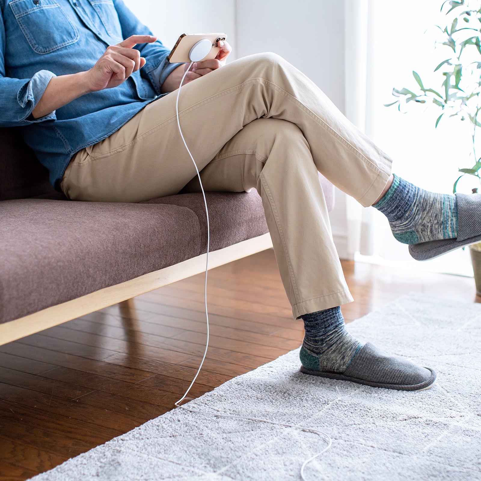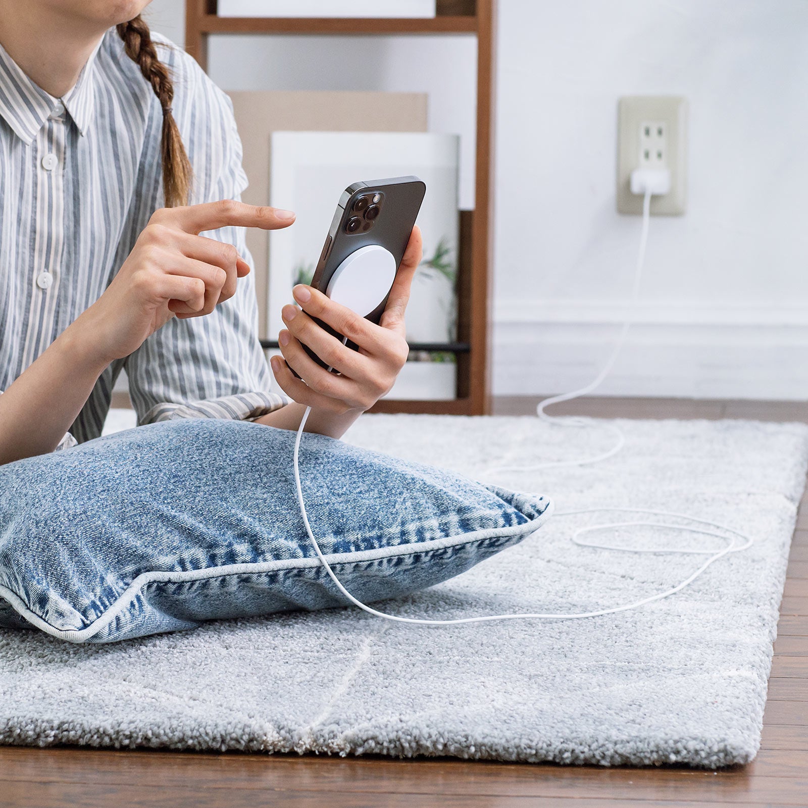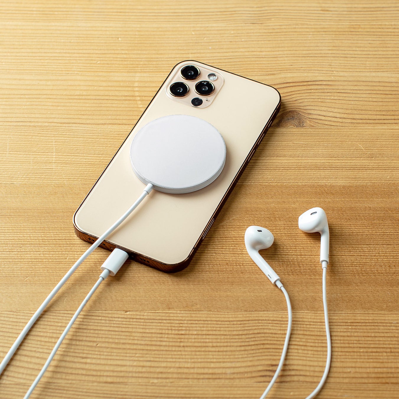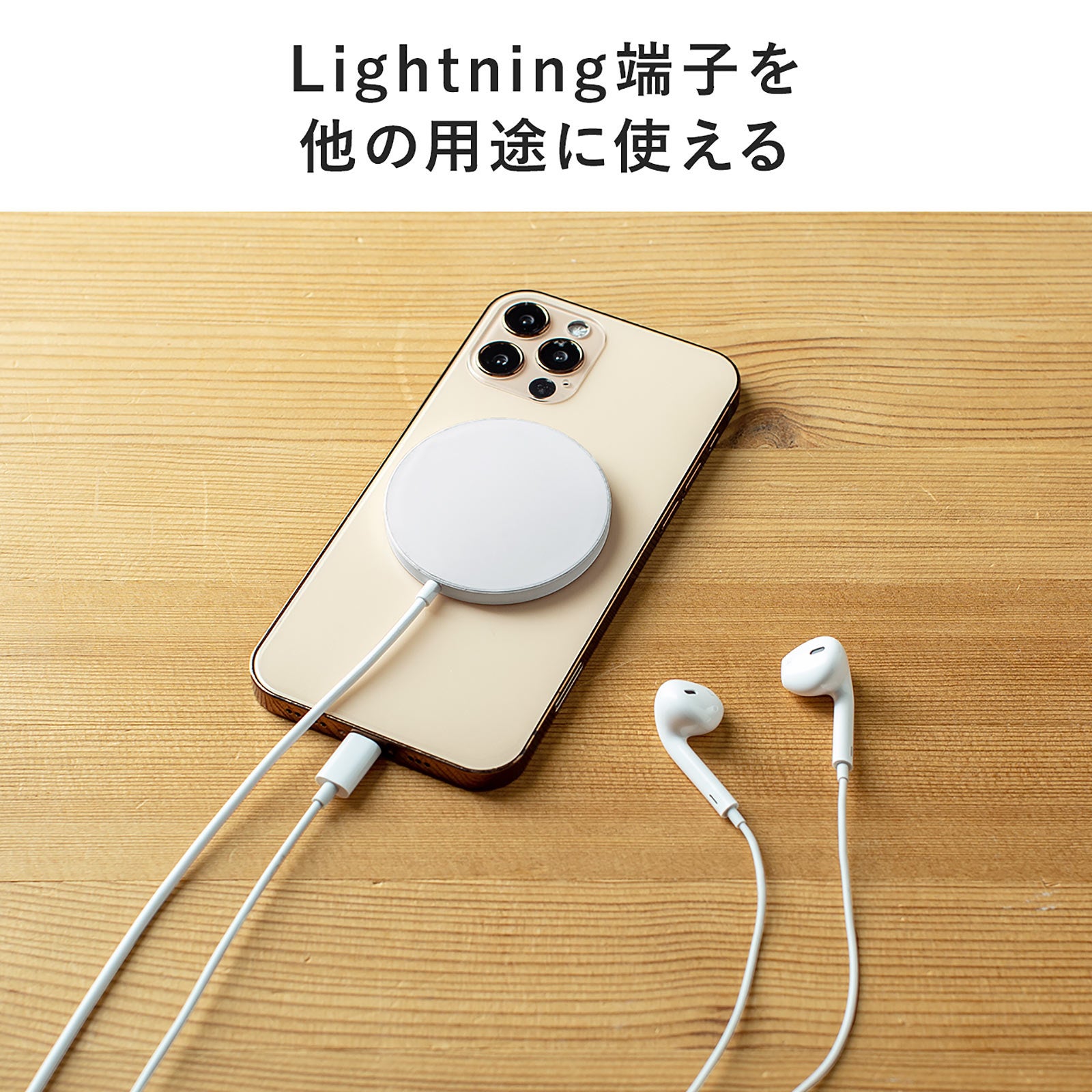 本製品は、MagSafe対応iPhoneシリーズにマグネットで固定して充電ができる、マグネット式のケーブル一体型ワイヤレス充電器です。充電にはLightning端子を使用しないので、Lightningイヤホン等を使いながら充電することができます。
