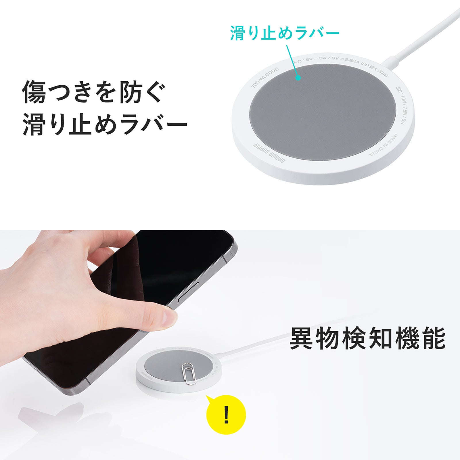 また、金属などの異物を検知すると充電を停止する異物検知機能を搭載しており、安全にご使用いただけます。