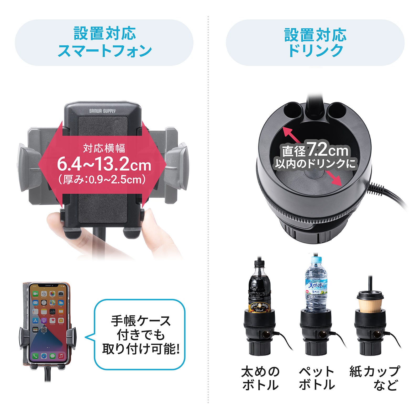 スマホ車載ホルダー ドリンクホルダー固定 フレキシブルアーム カップホルダー付き
