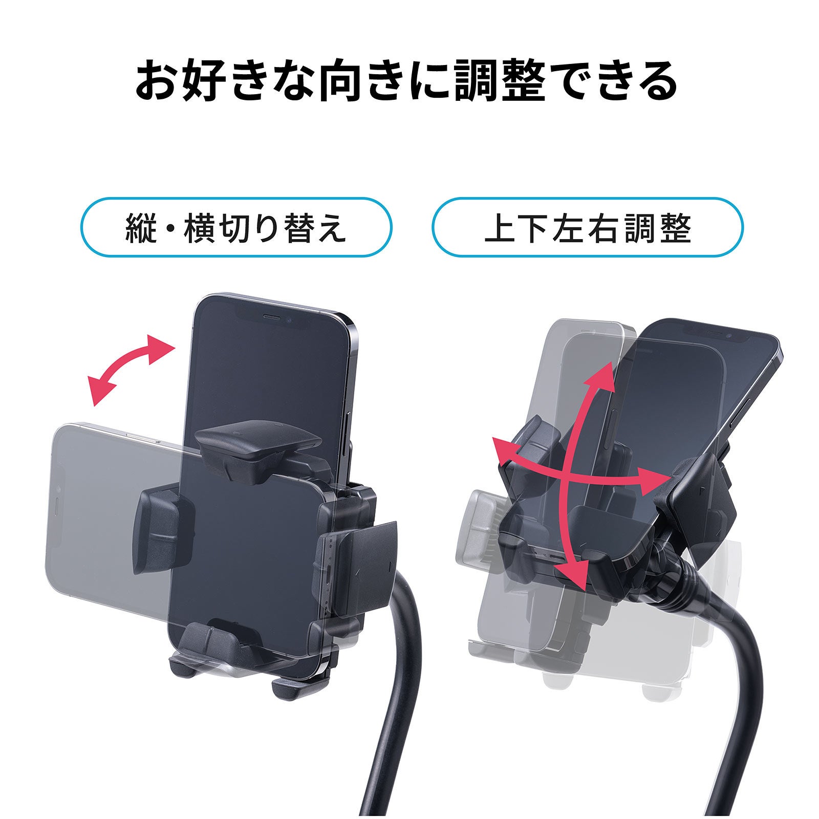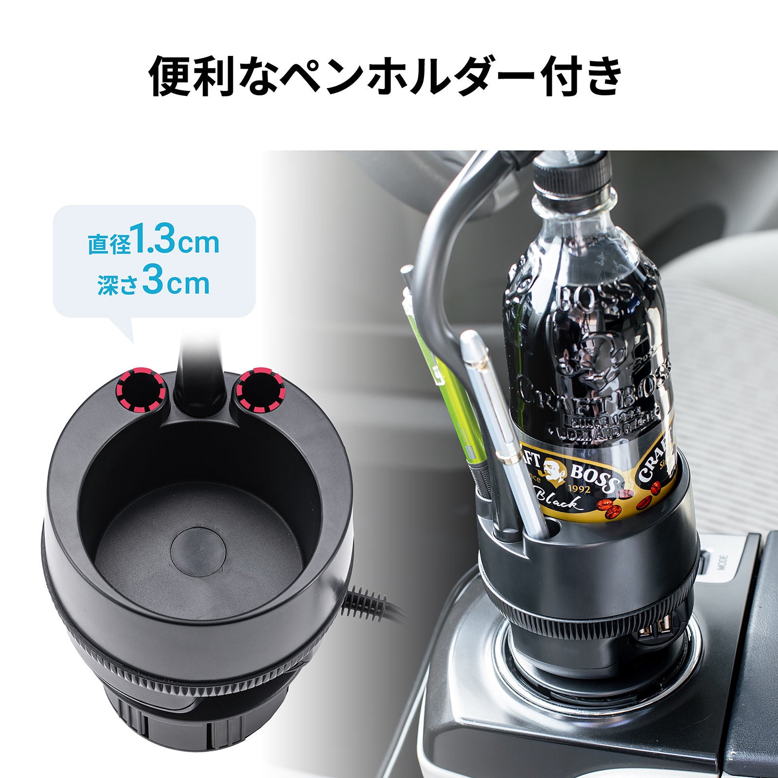 本製品は、車内のドリンクホルダーを利用してスマートフォンを設置できるスマホ車載ホルダーです。スマホをカーナビとして使うときや助手席で動画を見るときなど、使い方に合わせてフレキシブルアームを曲げてスマホの向きや高さを調整できます。スマホ車載ホルダー自体にもドリンクホルダーが付いているので、アルミ缶やペットボトル容器の飲み物を置けます。
