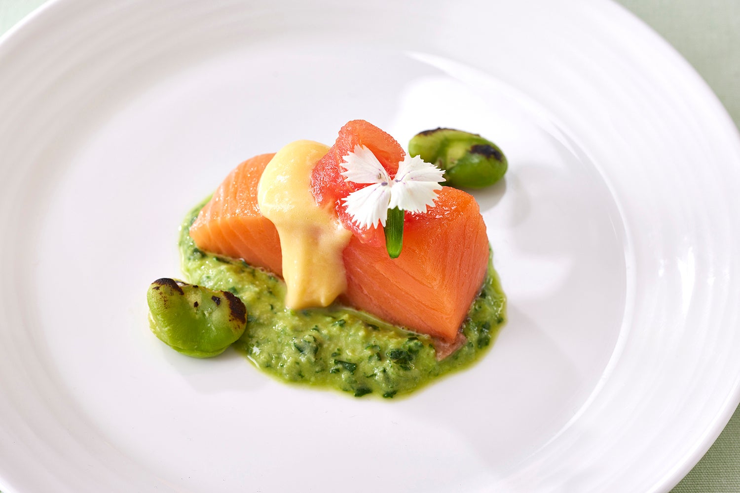 サーモンのミ・キュイ そら豆のフムスとオレンジ風味のオランデーズソース