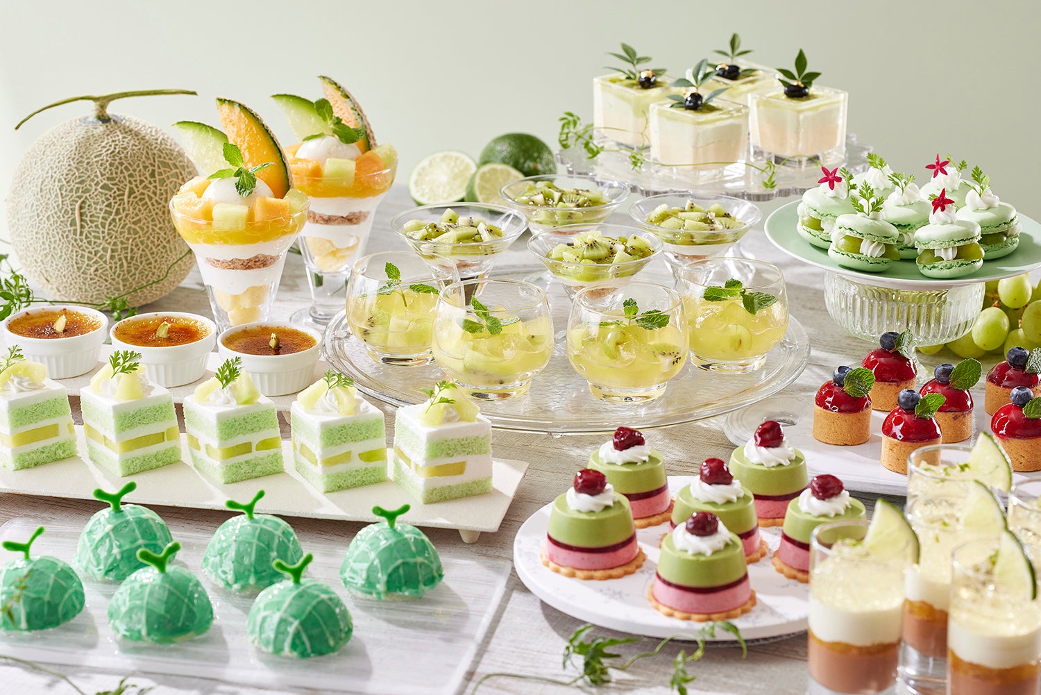 まばゆい新緑をテーマに、メロン・ぶどう・キウイなど瑞々しいフルーツをふんだんに使用したグリーンカラーのスイーツ約25種類に加え、季節の野菜や魚介などを使った本格ランチメニューをご堪能いただけます。