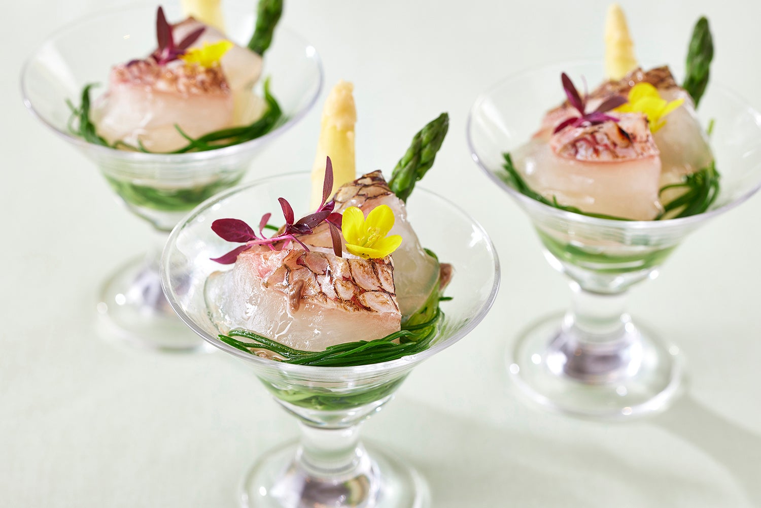 グリーンアスパラガスのサラダと昆布〆真鯛のカルパッチョ
