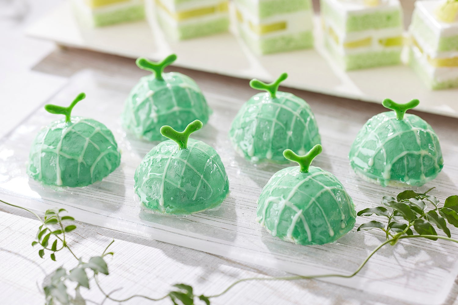 ブッフェコーナーには、サクサクのマカロンと果汁あふれるぶどうのハーモニーが楽しめる「グリーンぶどうのマカロンケーキ」や、ライムの風味が爽やかなジュレとムースに、パイナップルジャム、チョコレートムースの組み合わせが絶妙な「ライムのジュレ」、芳醇なメロンの風味とココナツの香りが初夏にぴったりの「メロンムース」のほか、「キウイとレアチーズケーキ」「ピスタチオチーズブリュレ」など、多彩な新緑スイーツが勢ぞろいします。