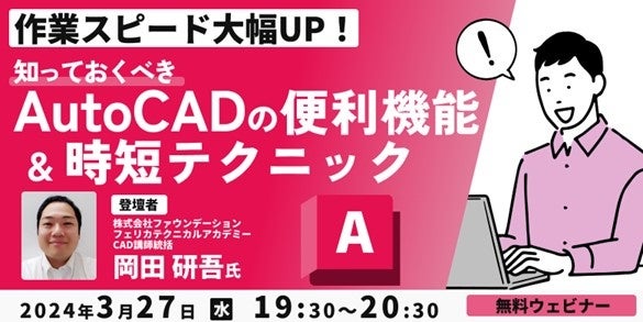 株式会社クリーク・アンド・リバー社(C&R社)は3月27日(水)、ご経験が浅めのCADオペレーターの方やAutoCADの使い方にご興味をお持ちの方などを対象に、無料のオンラインセミナー「【作業スピード大幅UP!】知っておくべきAutoCADの便利機能&時短テクニック」を開催します。